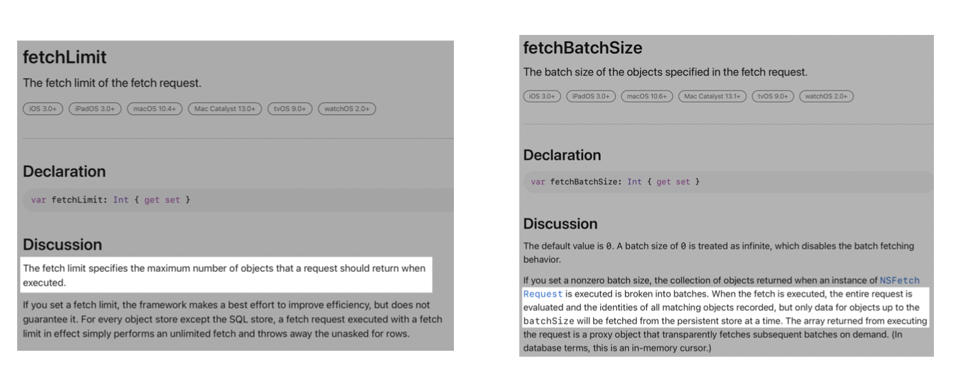 fetchLimit과 fetchBatchSize라는 두 프로퍼티를 발견했습니다.