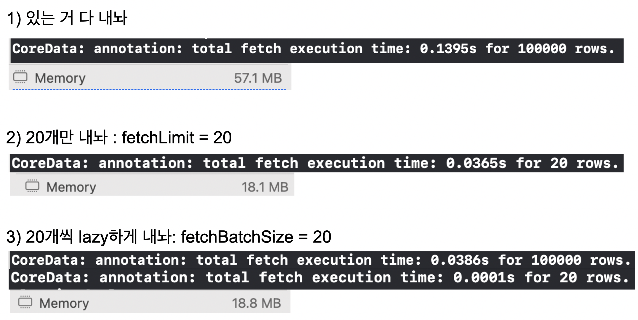 fetchBatchSize의 경우에는 최초에 100,000개를 모두 미리 찾아뒀기 때문에 20개를 가져오기만 하면 돼서
